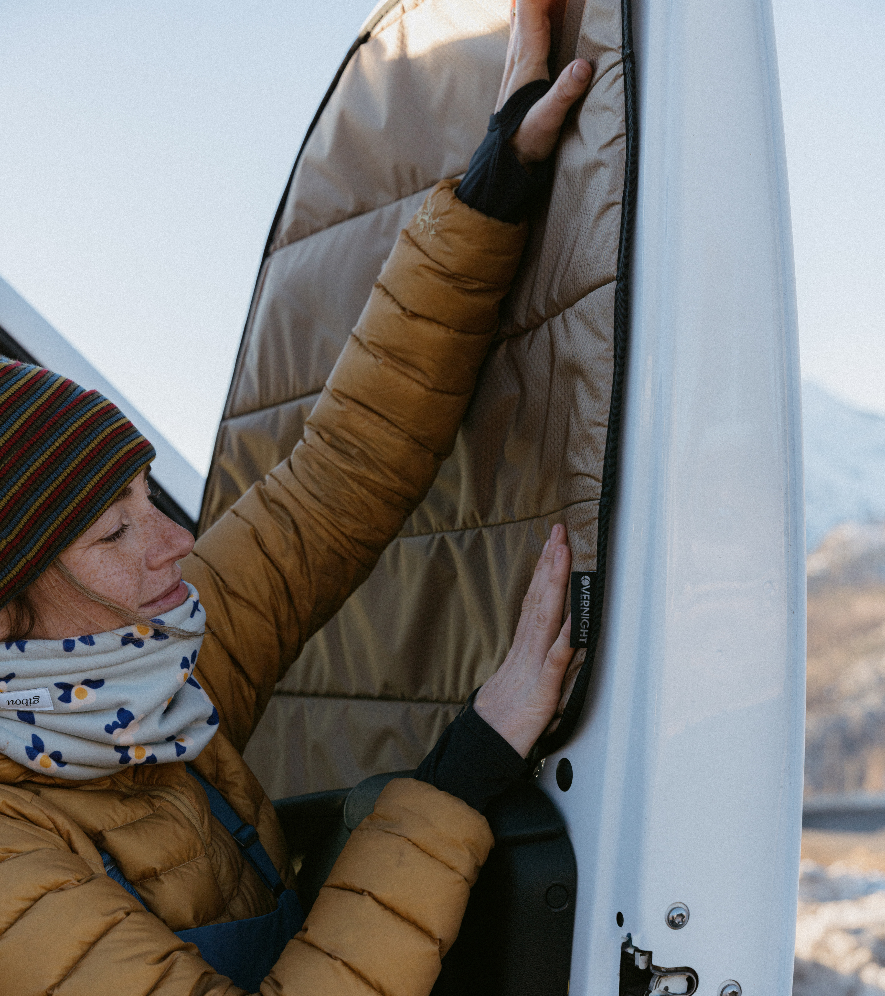 Our insulated van window covers were developed during our own travels. It is by traveling the roads ourselves, both in summer and winter, that we have transformed our own adventure. Our first road trips have certainly forged our adventurous spirits through certain challenges that you probably face. The snow that seeps in and melts on our bedspread when we open the rear doors to retrieve our snowboards. Our dog Pancho hesitates to fall asleep in the van in the middle of summer because it's just a little too hot. Does that bring back any memories?